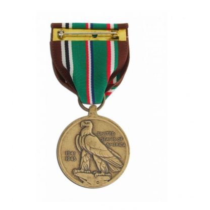 The medal’s front shows a Landing Ship, Tank (LST) and troops with an airplane overhead. The back has the American eagle and the inscription, “UNITED STATES OF AMERICA” and dates, “1941-1945.”