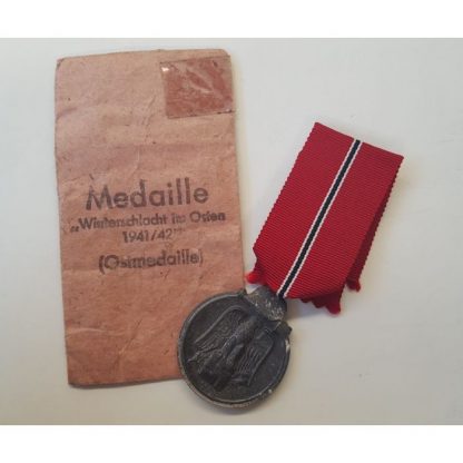 This Original WW2 Russian Front medal comes with an authentic red, white and black ribbon. This medal was awarded to both German combatant or non-combatant personnel who had participated in the first winter of Operation Barbarossa during November 15, 1941 to April, 1942. This also comes with the original paper envelope the medal was issued in. Normally these packets were discarded and not saved. In good original used condition.
