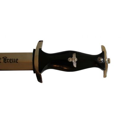 SS dagger has Genuine wood grip – the black anodized steel scabbard shell has nickel plated upper and lower fittings- The high quality steel blade is correctly etched with the SS motto “Meine Ehre heisst Treue” The cross guards are nickel plated . The black wood grip features a nicely detailed silver eagle and SS rune button.