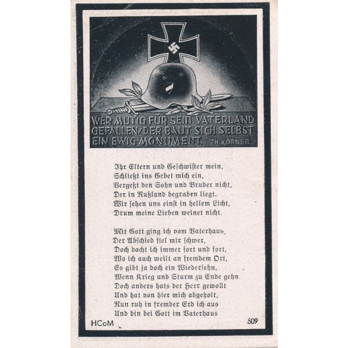 In contrast to other death cards the German government would not allow the printing of any WWII soldier’s unit information or a graphic cause of death.