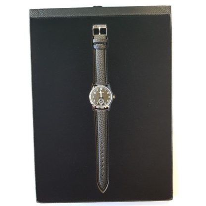 The German WW2 Army Service Watch with Black Strap. This watch is based on a 1938 model by a Swiss manufacturer and marked “Dienstuhr” (service watch) on the gloss black face and “Wassedicht Stahlboden” on back.