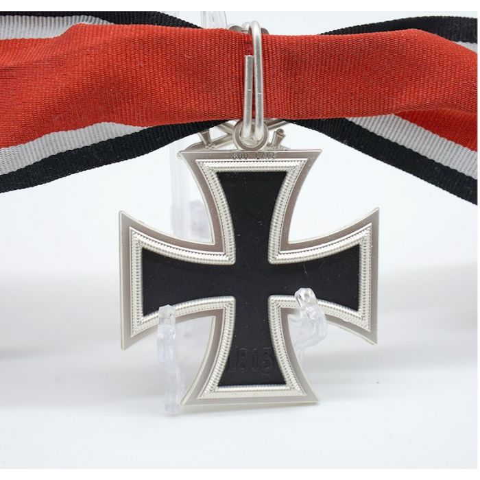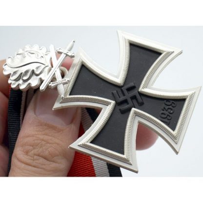 High quality 3 piece construction Knights Cross with Oak Leaves and Swords. With an Iron center and a frame made of zinc alloy. Marked 800 L/12. Silver, red, black and white ribbon included. Reproduction.