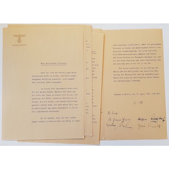 The Political Testament is in two parts and is 10 pages long and signed by Dr. Joseph Goebbels, Martin Bormann, General Wilhelm Burgdorf, and General Hans Krebs.