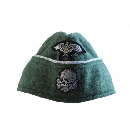 This field gray wool cap’s scallop is piped in a silver aluminum mesh piping. The front of the cap has machine woven silver-grey on black BeVo Totenkopf skull and eagle insignia.